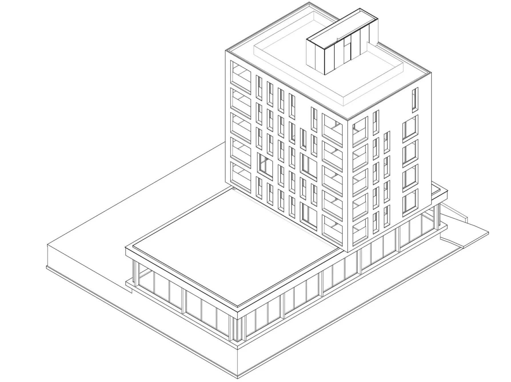 De nieuwbouw omvat meerder wooneenheden op de verdiepingen, een handelsruimte op het gelijkvloers en een ondergrondse parkeergarage. De volledige gelijkvloerse verdieping wordt ingericht als transparante, actieve plint, wat het handelskarakter en de beleving van de omgeving versterkt. De bovenbouw bestaat uit kwalitatieve wooneenheden met verbeterde lichtinval, grotere vrije hoogtes en hedendaags wooncomfort. Het ontwerp respecteert schaal, ritmiek en materialisatie van de omliggende bebouwing.