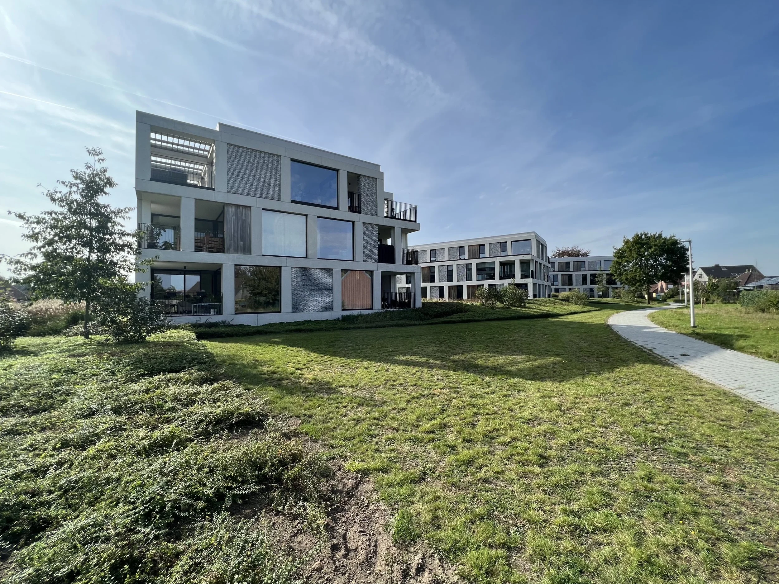 Verspringende blokken en niet-parallelle schikking creëren boeiende perspectieven en versterken de relatie tussen de gebouwen en het omliggende park. Luifels en gevelopeningen zorgen voor optische terugtrekking en schaduw, terwijl de leefterrassen privacy en kwaliteit bieden. Het semi-publieke park en de groene zones rond de gebouwen vormen een aangename, veilige en functionele buitenruimte. Organisch gevormde paden, hoogwaardige bestrating en zorgvuldig geselecteerde beplanting (ontworpen door Denis Dujardin) zorgen voor een duurzame, biodiversiteitsvriendelijke en onderhoudsvriendelijke inrichting. De openbare ruimte sluit aan bij de gebouwen, waarbij privacy van bewoners behouden blijft en recreatie en doorstroom van passanten optimaal wordt georganiseerd. Voor parkeren voorziet het project in een ondergrondse garage met 44 parkeerplaatsen voor bewoners, inclusief mindervalidenplaatsen, en 22 bezoekersplaatsen in collectieve hoven. De ontsluiting van de garage is strategisch geplaatst om de zichtlijnen op het toekomstige stadspark te bewaren en het publieke domein maximaal te behouden. De combinatie van compacte, hoogwaardige woningen, heldere architectuur en zorgvuldig ingepaste groene zones maakt van dit project een voorbeeld van duurzaam, stedelijk wonen in een groen kader, vlak bij het hart van Peer.