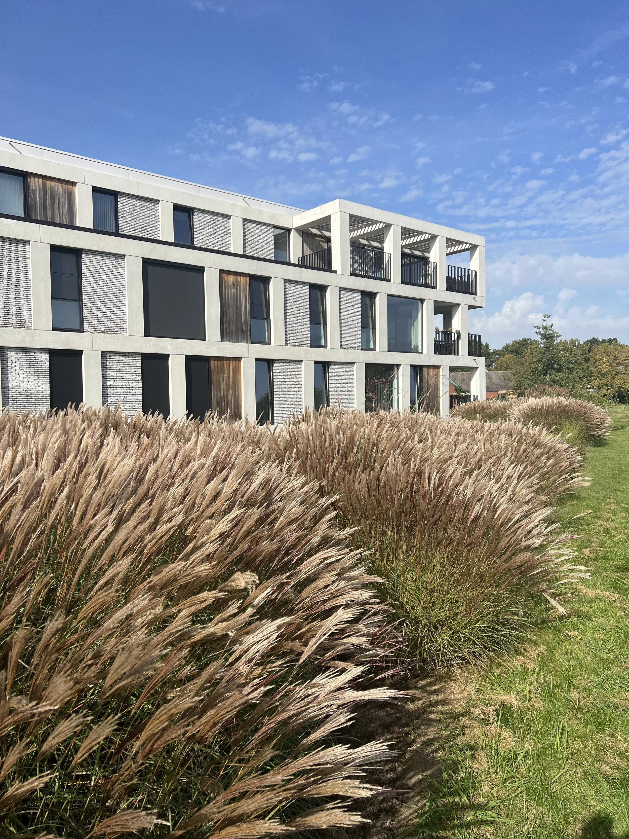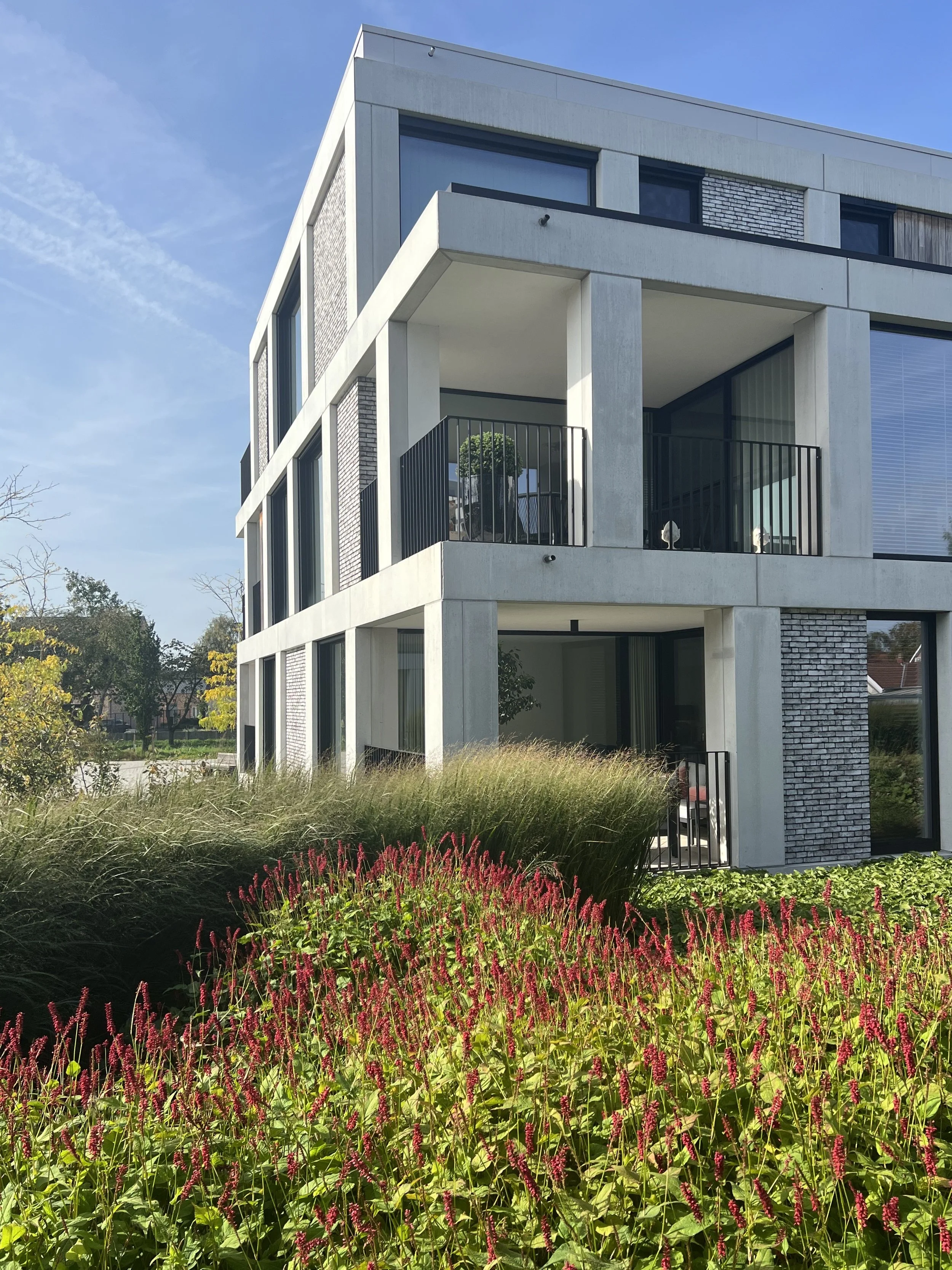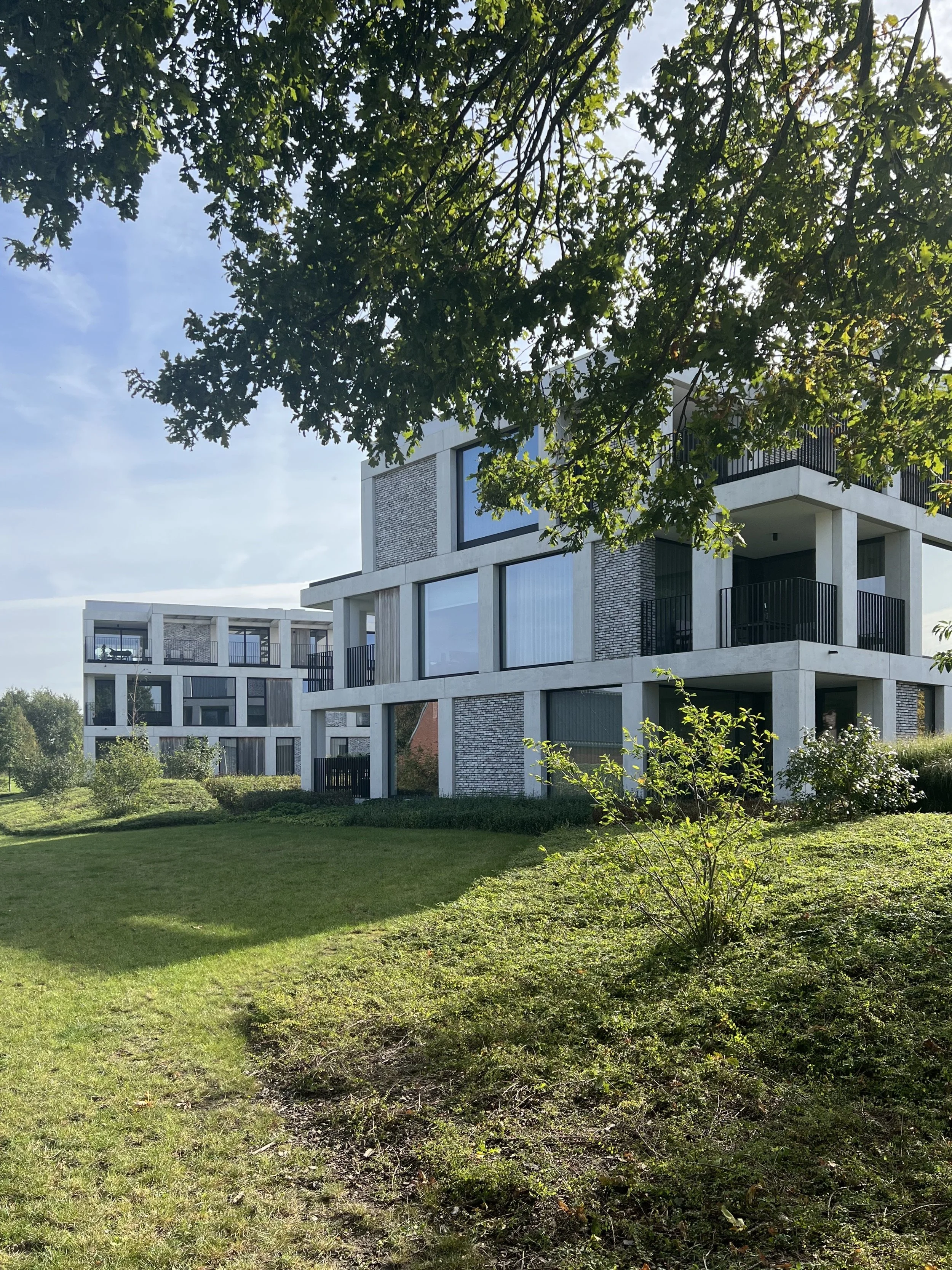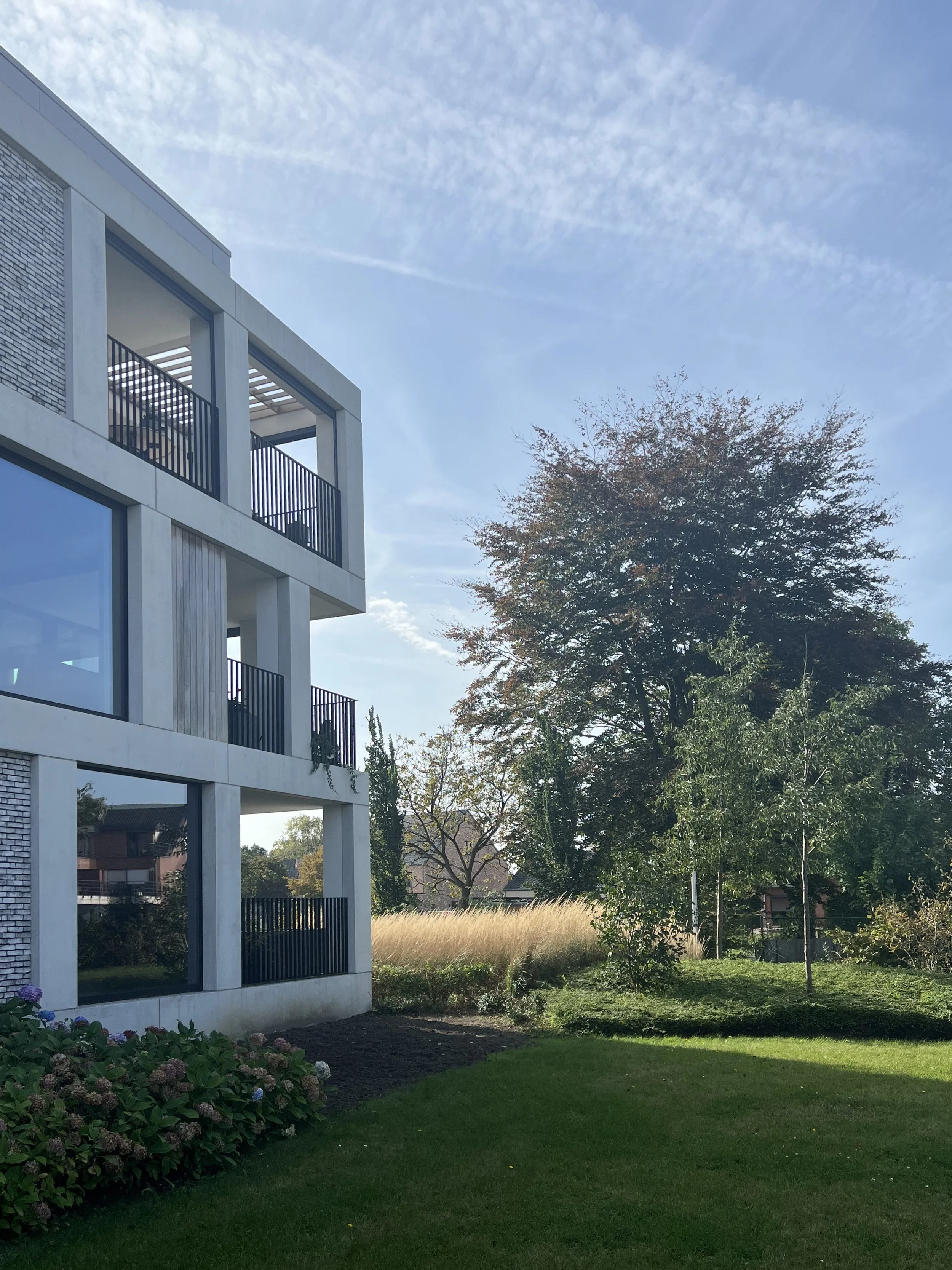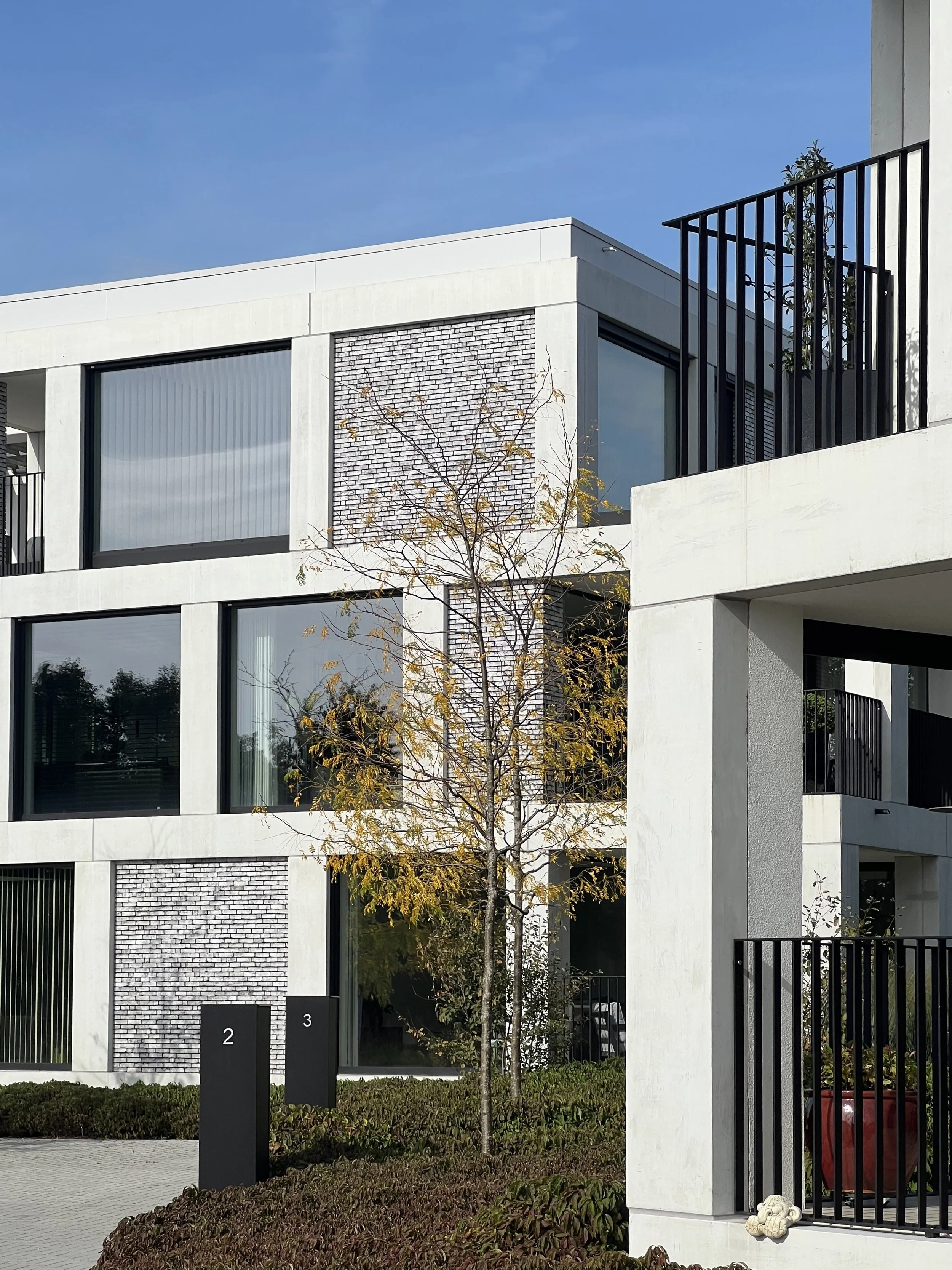 Elke villa is opgebouwd rond een centrale trap- en liftkern, van waaruit vier appartementen toegankelijk zijn. De terrassen zijn inpandig en bieden altijd twee oriëntaties, waardoor zowel bezonning als zicht op het park optimaal wordt gegarandeerd. De woningen variëren van compacte appartementen van 87 m² tot ruime dakappartementen van maximaal 145 m², met een duidelijke scheiding van leefruimtes, slaapvertrekken en bergingen. Architecturaal wordt gekozen voor een oprechte, strakke gevelopbouw: baksteen in lichte tinten wordt gecombineerd met zichtbeton en subtiele houtaccenten, wat zorgt voor een heldere en rustige compositie.