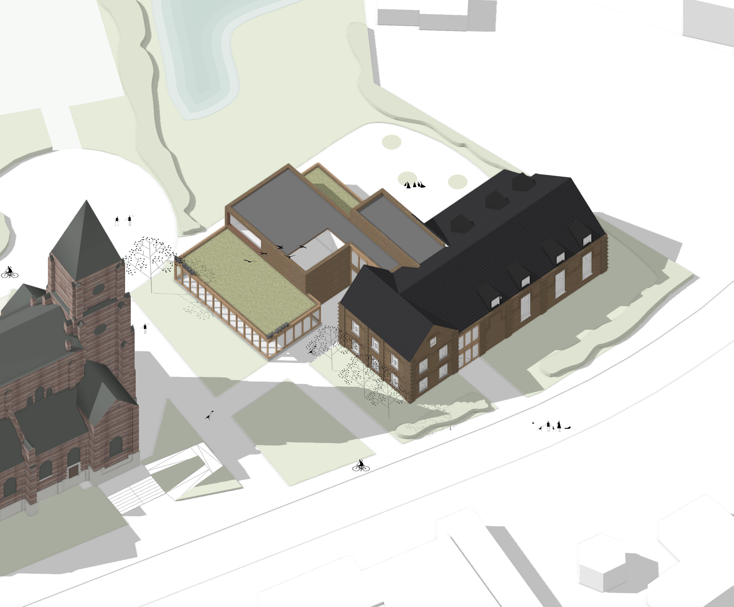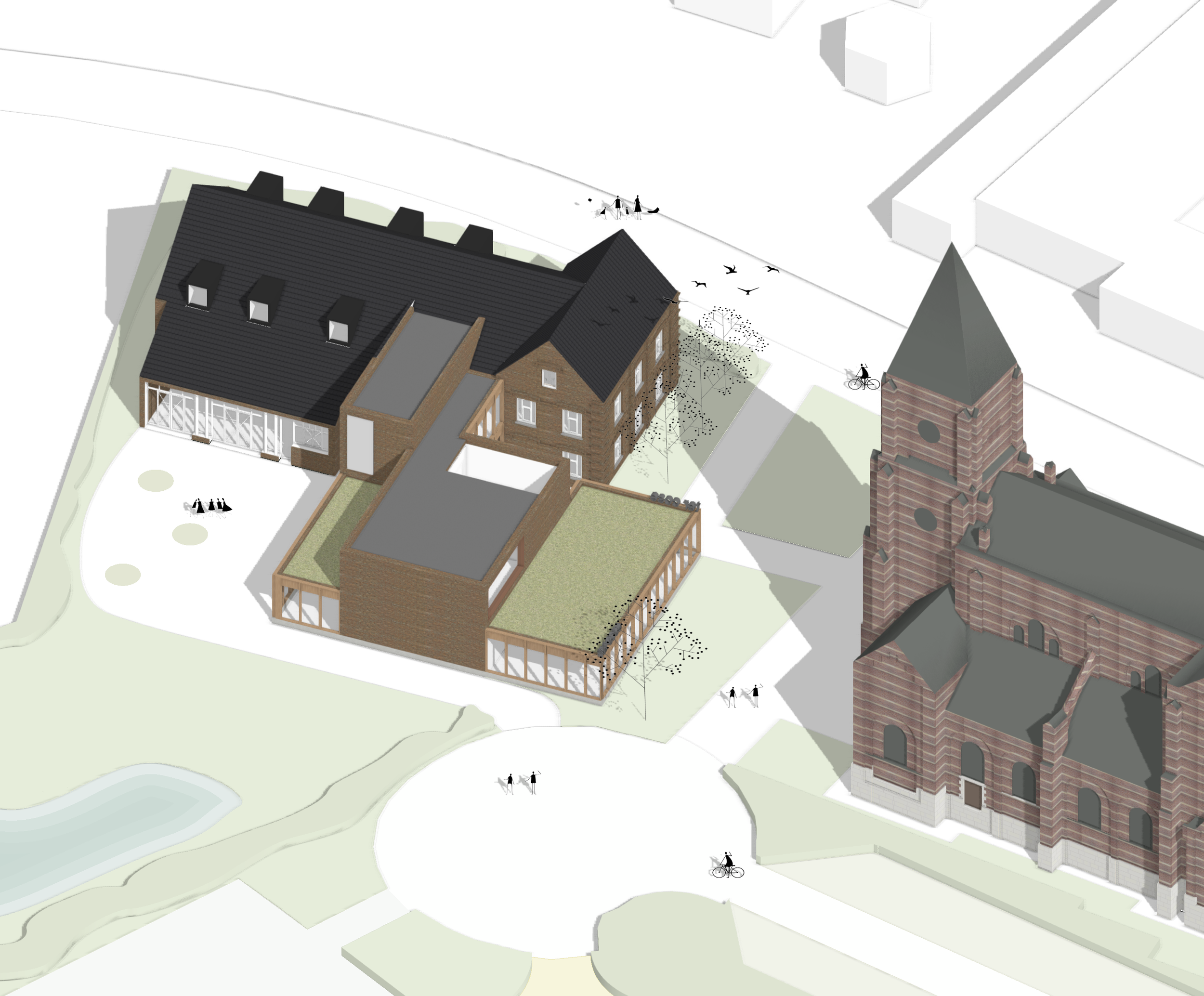 De ingreep is bewust ingetogen. De bestaande gebouwen blijven dragers van identiteit, terwijl een compacte nieuwbouw het geheel structureert en nieuwe verbanden legt. Door haar positie en schaal brengt deze toevoeging rust en leesbaarheid in een vandaag diffuus geheel en ontstaat een duidelijke organisatie van binnen- en buitenruimtes.